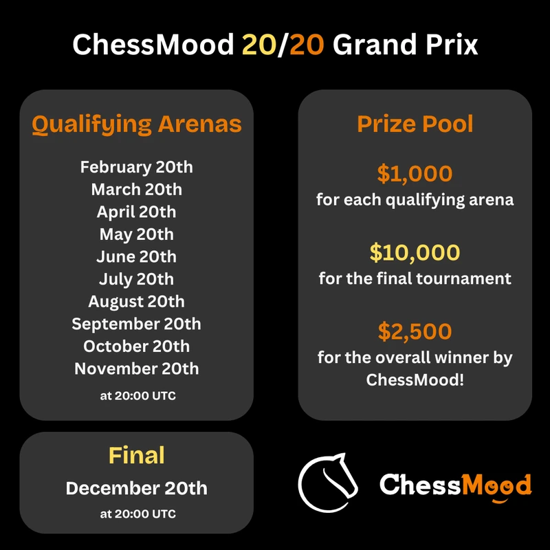 Lichess and ChessMood are pleased to announce the ChessMood 20/20 Grand Prix, held on a monthly basis on the 20th day of each month, with each event starting at 20:00 UTC, from February 20th to December 20th, 2025.